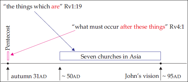 We also read that John heard “the first voice which I heard as it were of a trumpet” Rv4:1 that introduced the first vision Rv1:10. We must not ignore both clues which tell us that the second vision is a continuation of the first one. Hence, even if we accept Dr Paulien’s idea that the book was written to the churches in western Turkey, the Day of Pentecost (autumn 31ad) cannot precede the period of churches which began to exist after 50ad.