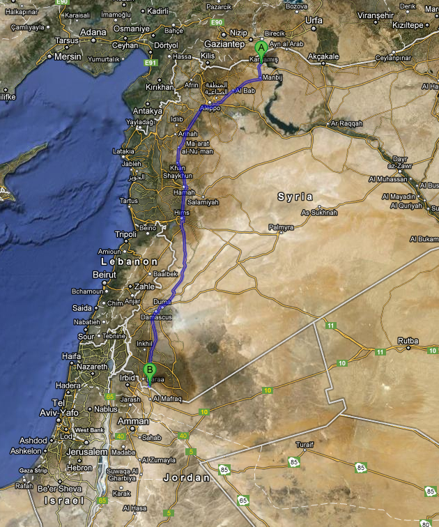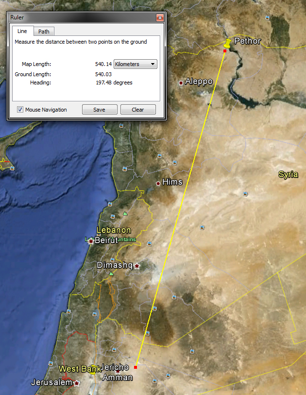Obecnie odległość drogowa od Petoru do granicy Syrii z Jordanią wynosi 657km, a w Jordanii (poniżej) do Jerycha 93km, razem 750km.