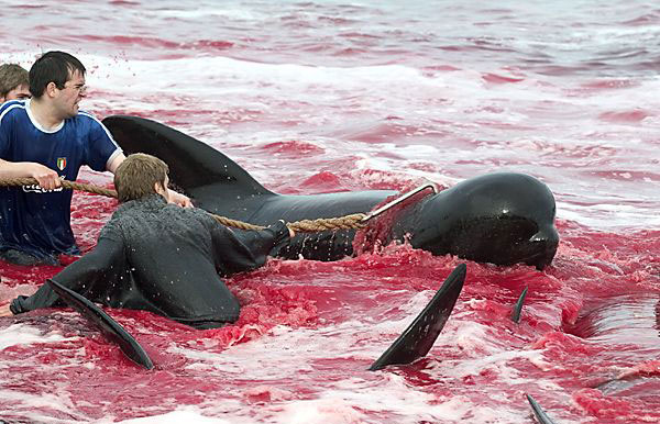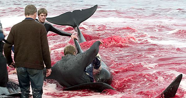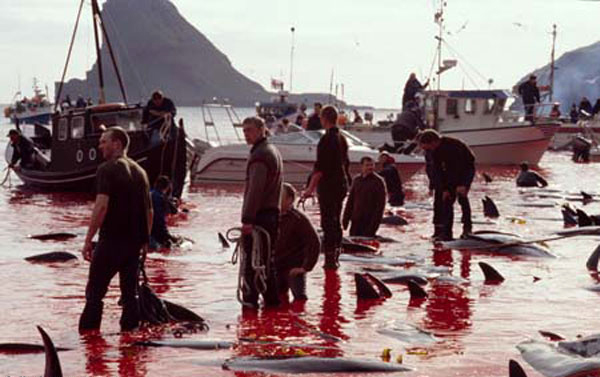 Może się wydawać że taki obraz pochodzi z Apokalipsy lub z jakiejś wielkiej katastrofy, ale jest on z uroczystości obchodzonych każdego roku przez mieszkańców wysp jako dowód dojrzałości młodzieńców. W uroczystościach biorą udział dzieci i starsi, a na obliczach wszystkich uczestników maluje się uśmiech. Ale czemu woda jest taka czerwona? Dlatego że podczas uroczystości giną setki delfinów, a wiele z ich gatunków znajduje się blisko wyginięcia. Woda jest czerwona od krwi, a umierające delfiny umierają cierpiąc i wydając dźwięki przypominające płacz dziecka. Niektóre z nich są kotne, zostają więc rozcinane, a inne są w towarzystwie swoich dzieci.