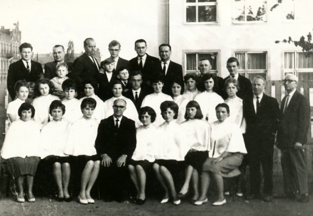 Chór zboru łódzkiego, na podwórku przy ul. Kopcińskiego 67, 24 maja 1964 r.  Rząd I: Danuta Zręczycka, Halina Wójtowicz, Barbara Kot, kazn. Marian Kot, Elżbieta Steplewska, Teresa Tarczyńska, Ewa Kadyrow, (?) Skrzypczak.  Rząd II: Joasia Białecka, Anna Kowalska, Henryka Tomańska, Eugenia Karauda, (?), Bogusław Kot, Hanna Białecka, Grazyna Białecka, Janina Rafanowicz, Jadwiga Materka, Zofia Czerwińska, Teodor Skrzypczak, Symforian Czerwiński. Rząd III: Stefan Wawrzyniak, (?) Kowalski, Andrzej Wawrzyniak (niżej), Zygmunt Śliwiński, Adam Kadyrow, Ryszard Cymerman ( obydwaj niżej), Zbigniew Jankiewicz, Piotr Zręczycki,  Stanisław Wójcicki, Józef Wójtowicz, (?) Stanisławski.